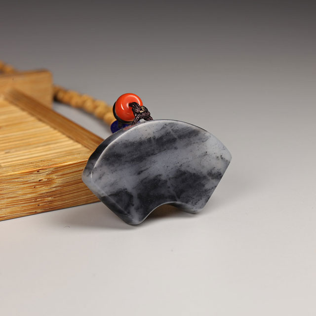 所谓自然即万物生长,自然而发。此枚扇形牌造型精巧玲珑,设计师稍加定型,略事雕琢折痕,衬以本身黑白玉色,倍显云山雾罩之美,颇见自然之趣。